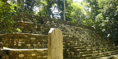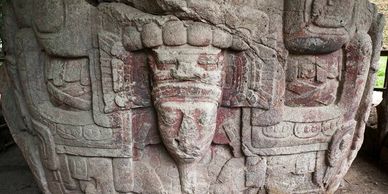 Quiriguá is known for its wealth of sculpture, including some of the tallest stone monoliths ever erected in the New World. The largest one is a monument measuring 35 feet in total length and weighs about 65 tons. It was carved from a single block red sandstone and brought from quarries 3 miles away.
